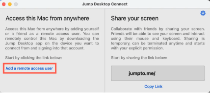 Note : dans l’interface de Jump Desktop Connect sur le Mac, il faudra cliquer sur « Add another remote access user » et non pas « Add a user » car il y a déjà une utilisatrice.