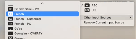- Au clic sur ce bouton, apparaît un menu où il y a la liste des configurations clavier pré-enregistrées et/ou précédemment choisies et un sous-menu « Other Input Sources ». Ouvrir ce sous-menu ;