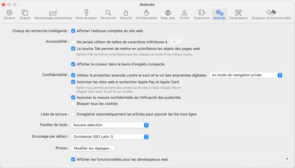 - Ouvrir le menu « Safari », puis « Réglages », puis « Avancés » ;